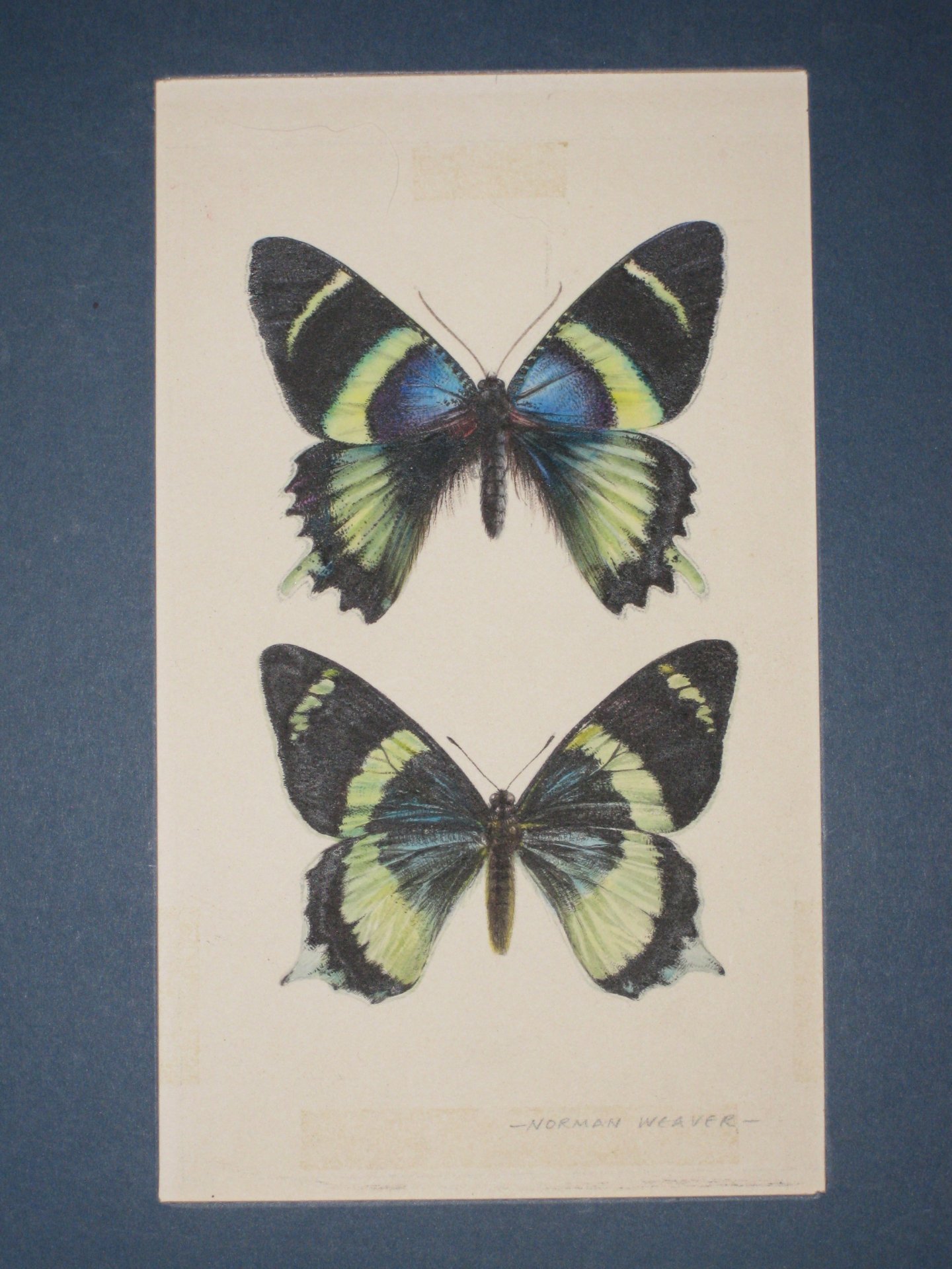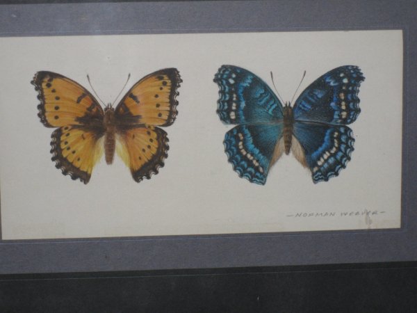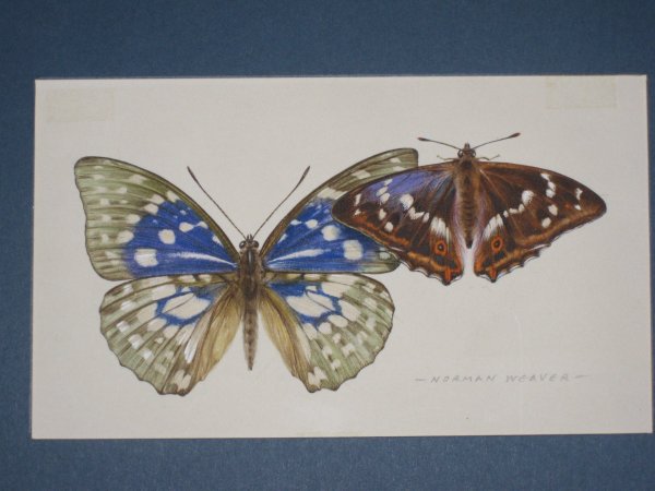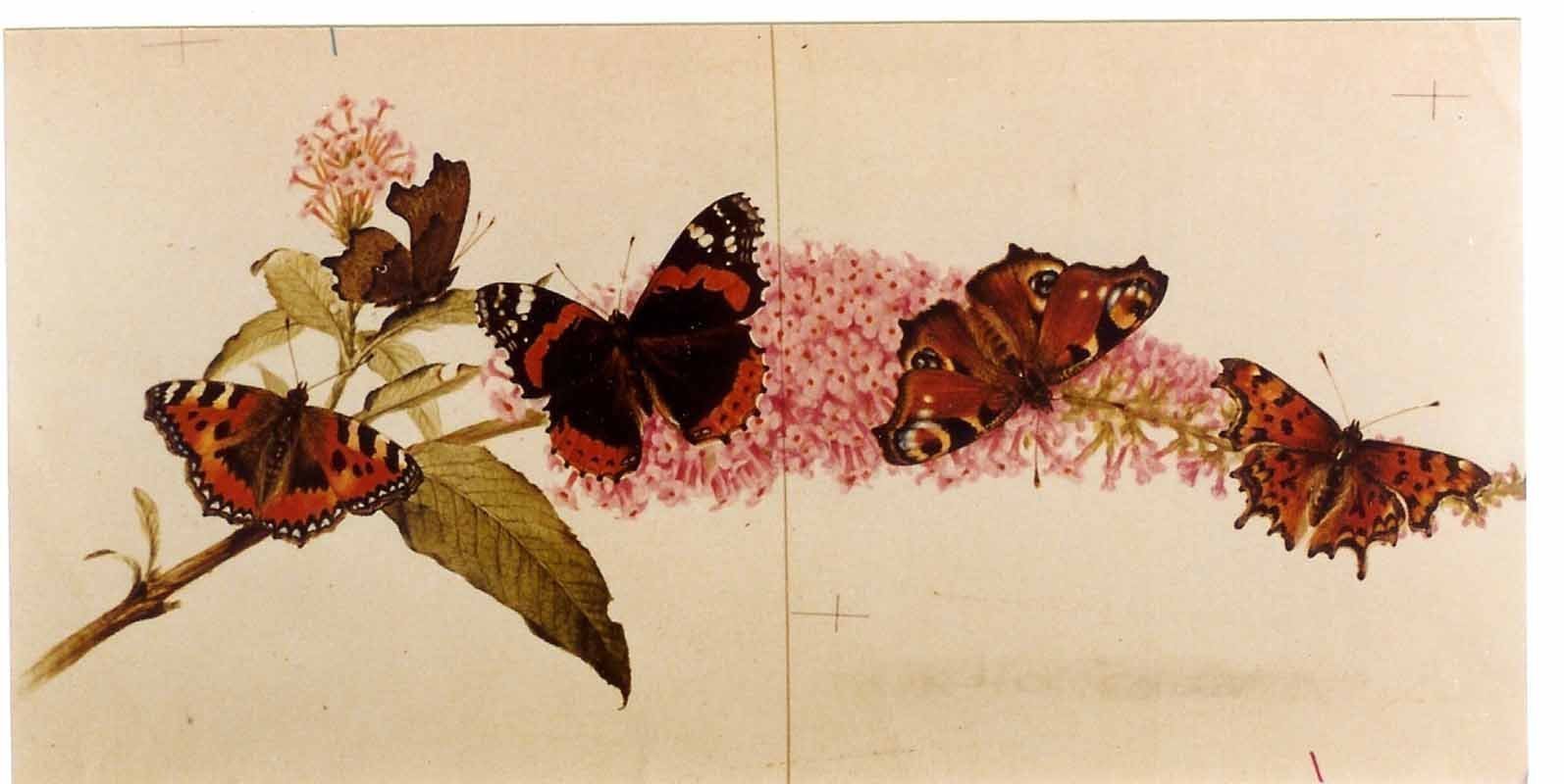 The above original artwork for the illustration on Page 16, has the following caption: "Sasakia, the Japanese national emblem (left) and the Purple Emperor (above) are two butterflies whose wing structure gives them a special colour. The gleaming 'oil on water' effect, is produced by light refracting from irregularities in the wing.