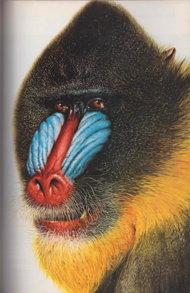 Also from the same book - a rather more colourful painting of a mandrill. The original used to hang on the wall of Dad's studio, but I have no idea what became of it. It was the source of great fascination to my niece, Zelie, when she was a toddler. She would point at it and say "monkey!" Dad would tell her it was a mandrill, and we only realised that she might have got the wrong end of the stick when she pointed at a neighbour called Andrew, and started to do monkey impressions! (Remember this, Zelie?)