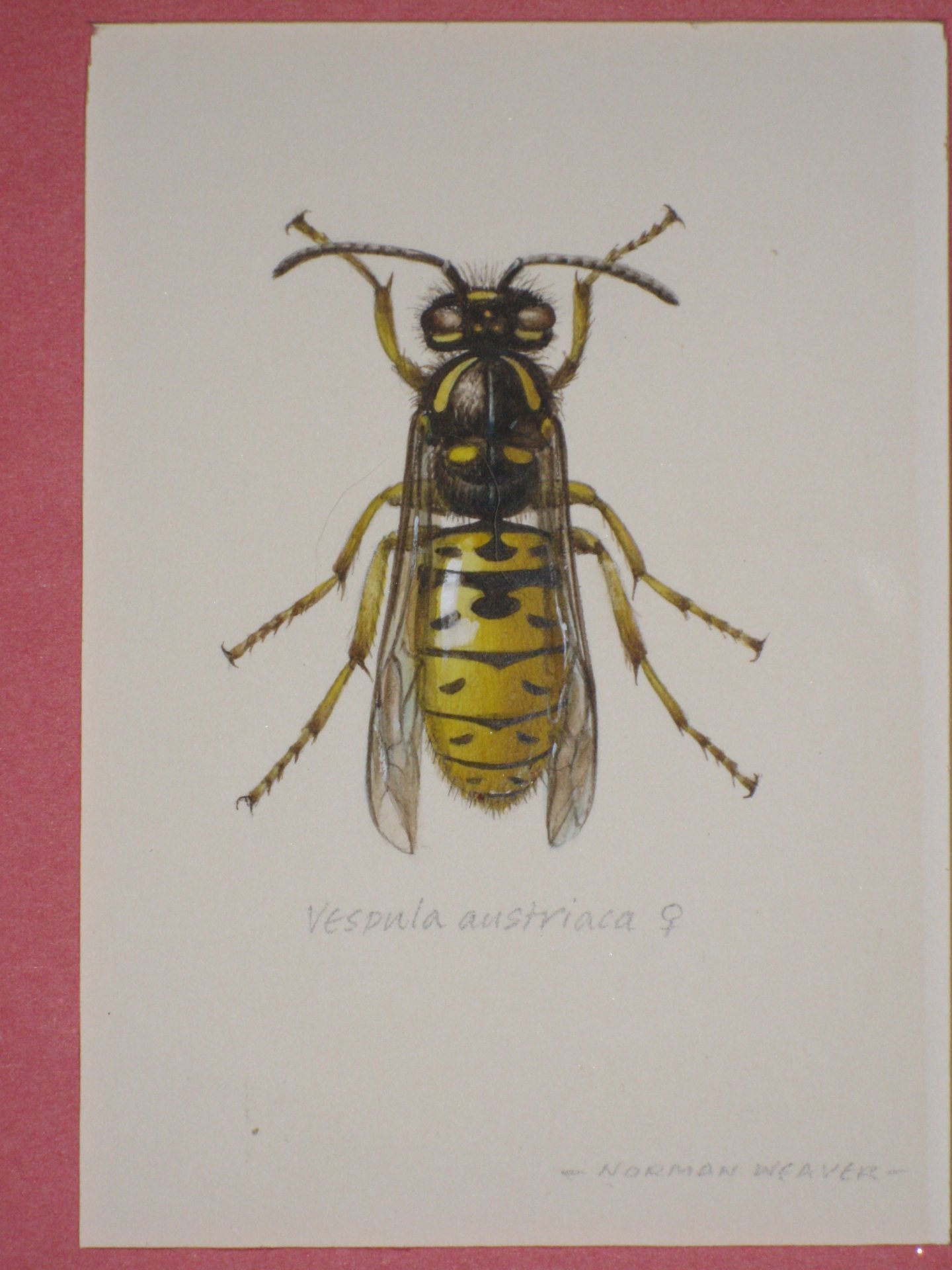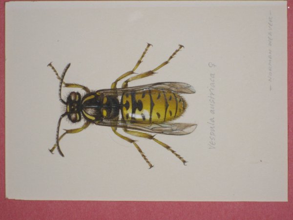 This photo has kindly been supplied by Dr. Steve Huckvale, who owns the original of this painting from the above book. It features a queen wasp, describing how the fertilised queens look for sheltered spots to spend the winter, in a torpid state.