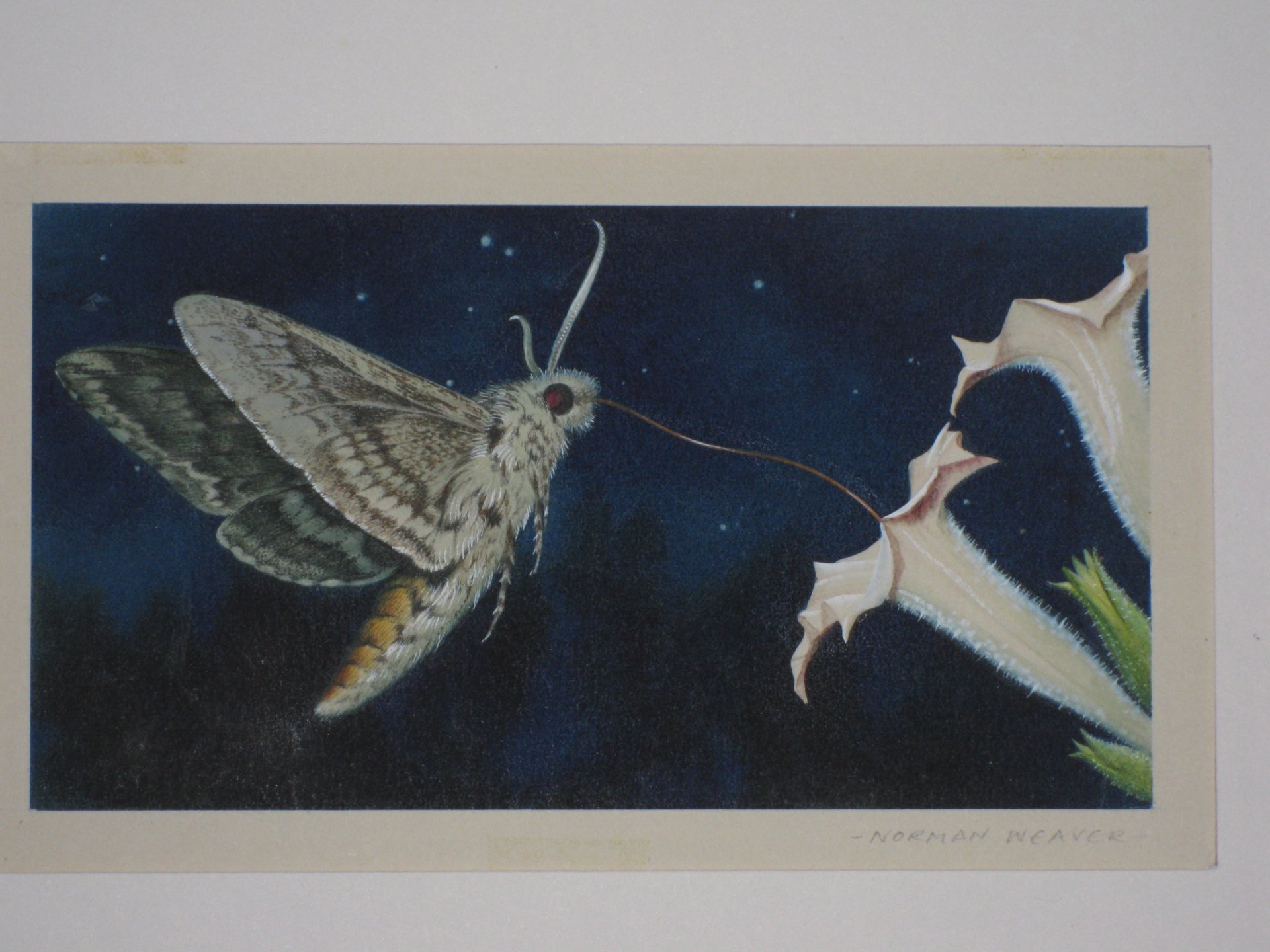 The last in this series is a particular favourite of mine (if you ever want to sell this painting, Steve - tell me first!). It shows a Sphinx moth, taking nectar from the flower of a tobacco plant at night.
