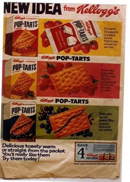 "Pop Tarts" disappeared for several years, but I remember the original ones, and being sent some samples to try way back in the 60s. They were almost exactly like the ones we buy today... except the prices here were in old money!