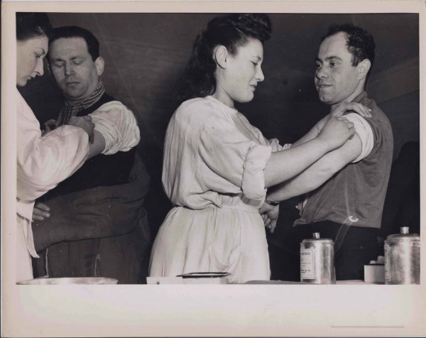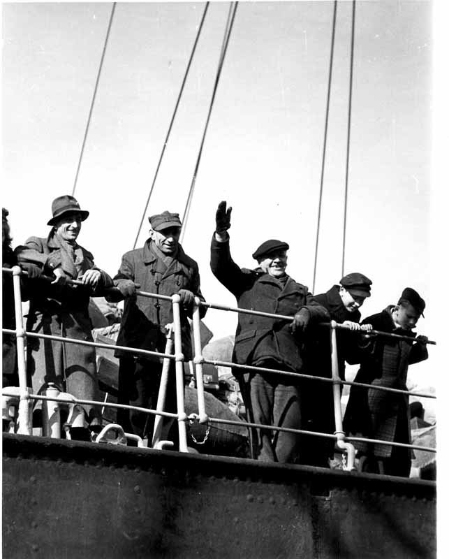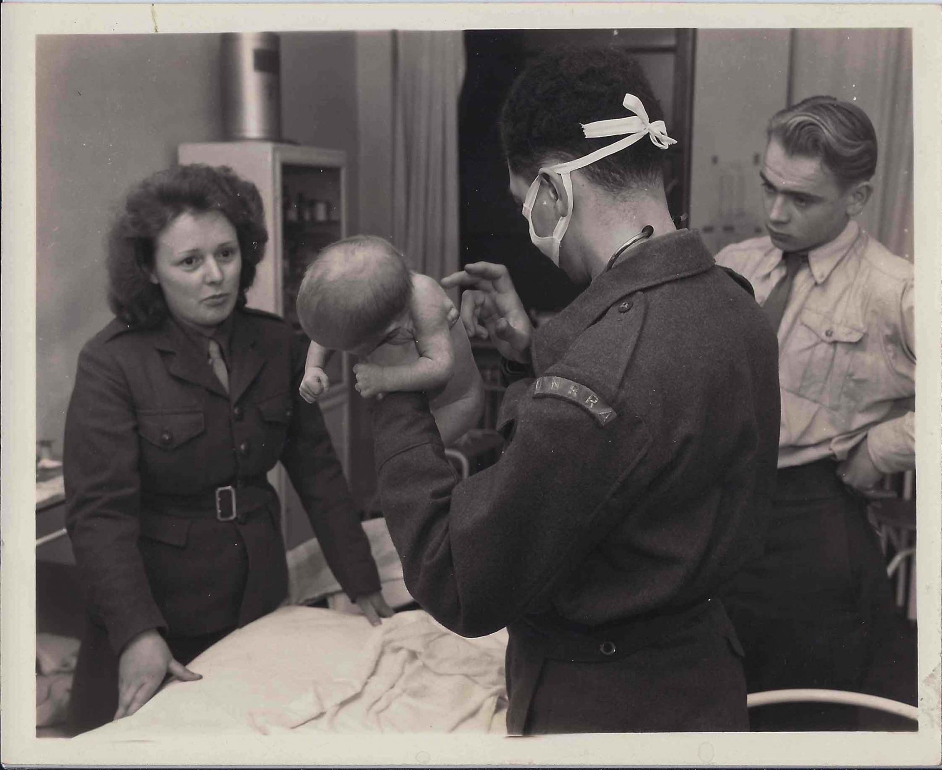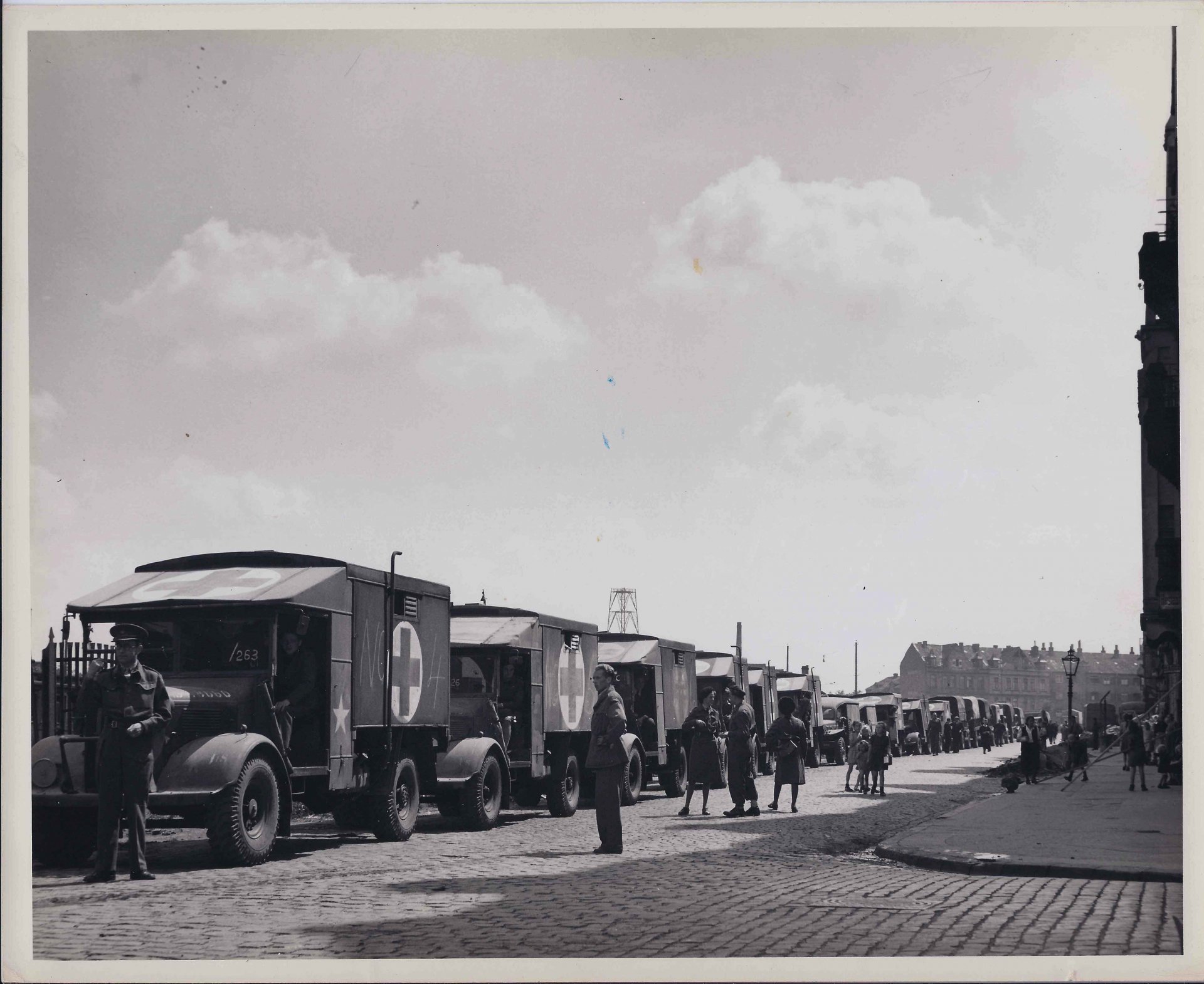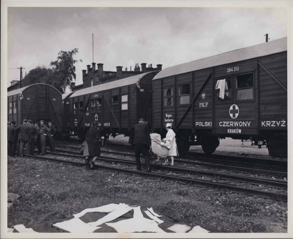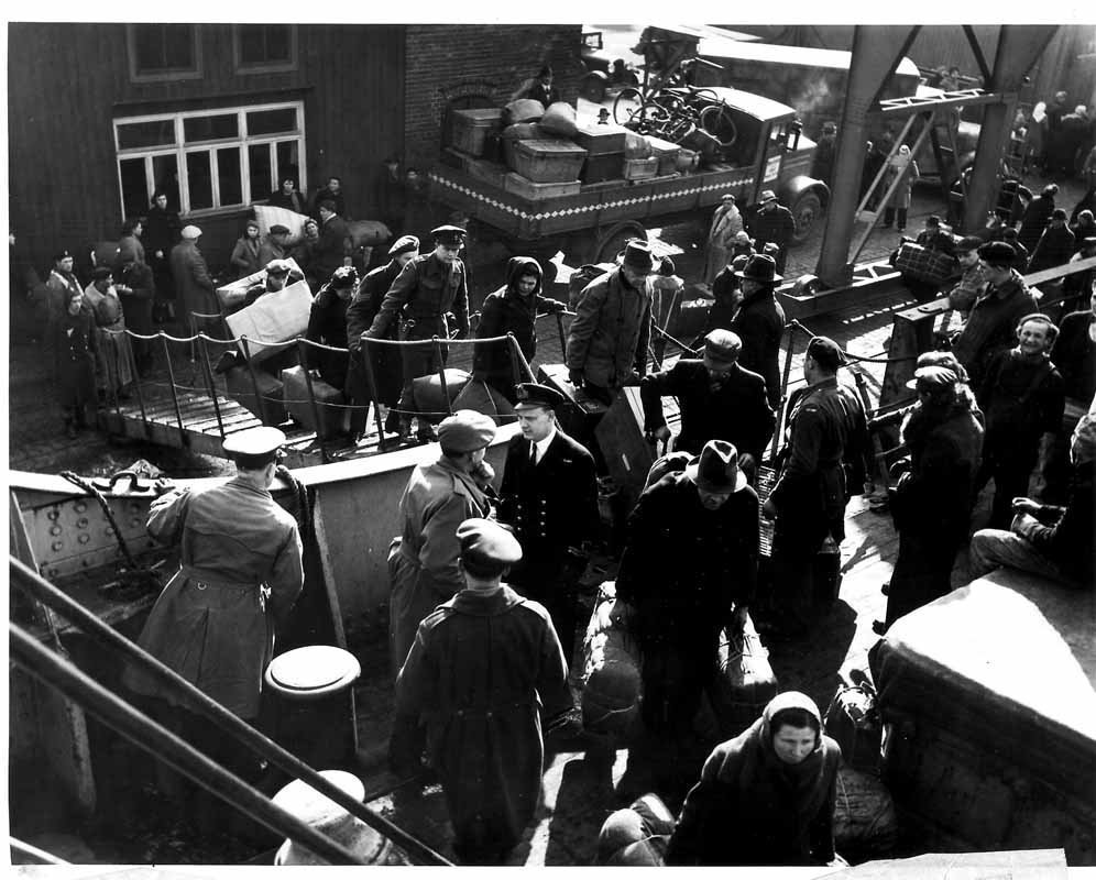 The next set of photographs shows a few images of the repatriation of 1,400 Polish displaced persons. The first shows the embarkation at Lubeck docks, on their way to Danzig, and my father has written on the back of one of these photos "most carried all they owned". These photos are followed by some showing the deported families travelling by road and rail, then awaiting their transit camp beside the railway track where they were offloaded, setting up temporary home for the next three days at Danzig, The last photo in this series shows a young girl being examined in a hospital in Danzig.