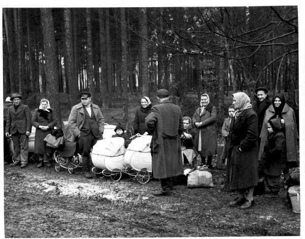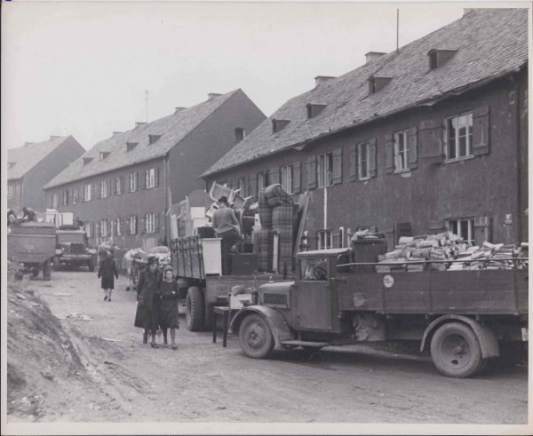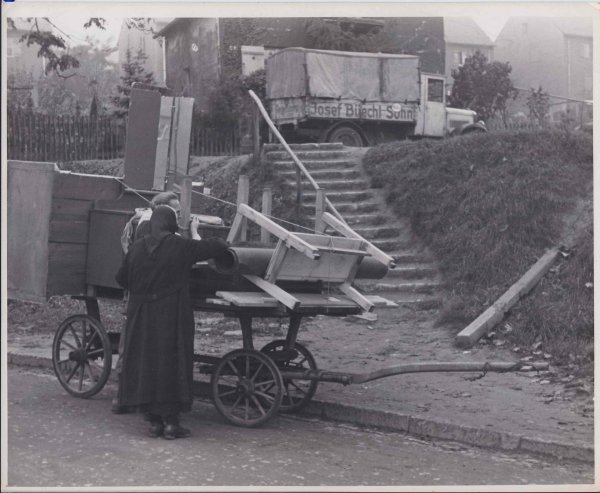 The following five photos are from an envelope simply marked "Eviction of German civilians from their homes". The Imperial War Museum has dated these as having been taken in 1946, when German families were being moved to new German billets. One shows a small boy watching as the contents of his home is loaded onto a lorry, and another depicts an elderly couple loading what they can onto a handcart.