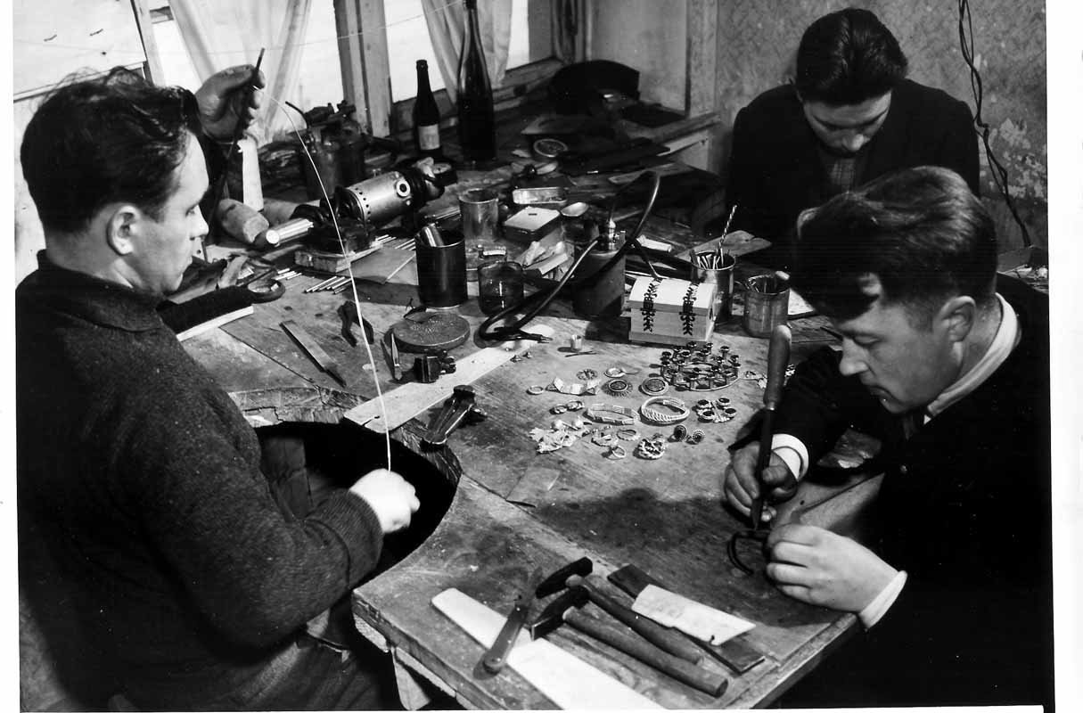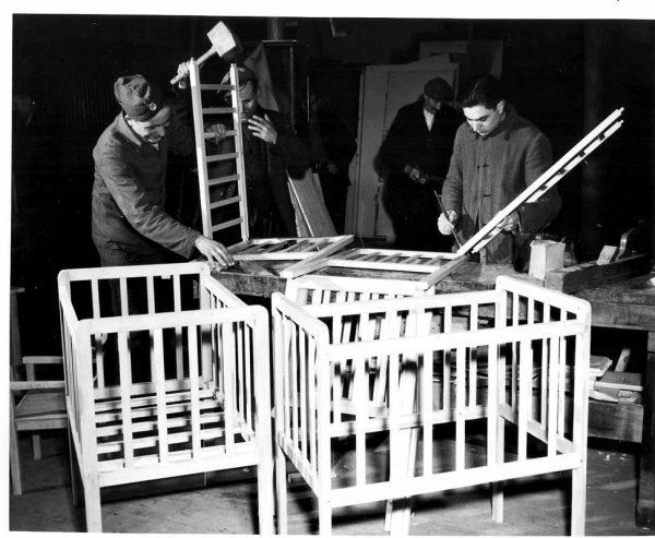 This first group of photos shows various workshops. Scrap tin cans are being recycled into jewellry, teapots, etc., scrap wood is being used to make cots and toys (although, rather poignantly, leaning on the wall behind the man on the right painting the Noah's Ark figures, pieces of wood have been shaped ready to be made into rifles), and parts of shoes are being salvaged.