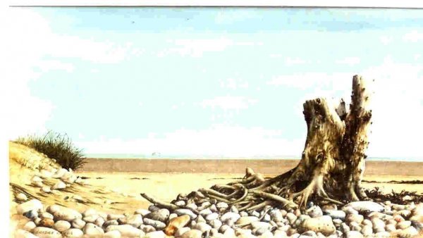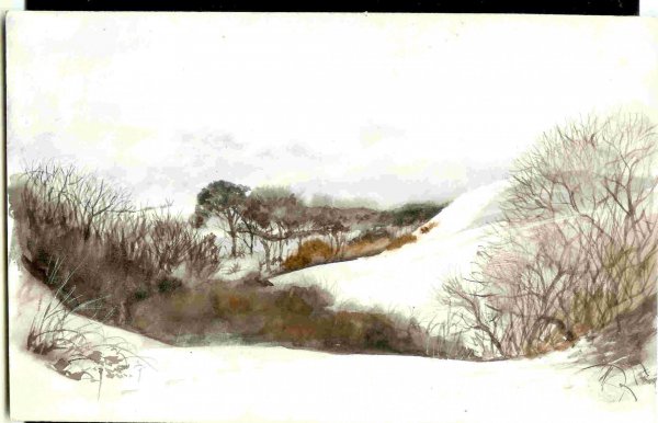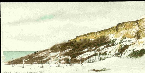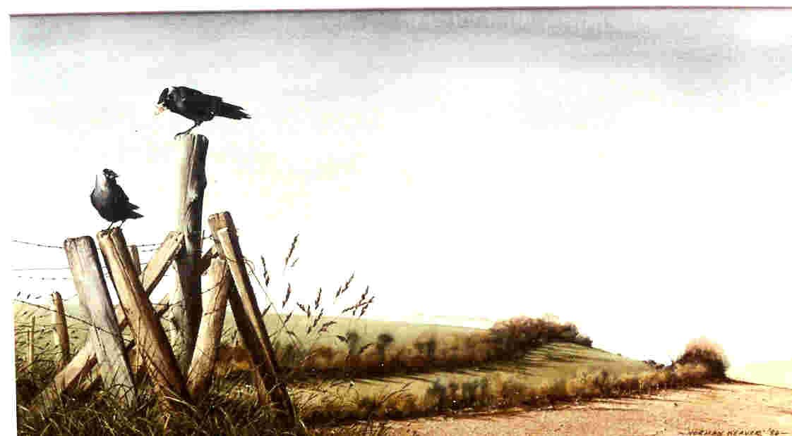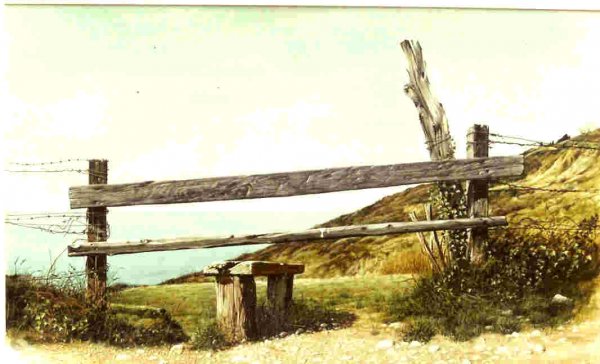 The pictures are all of quite well-known landmarks, but from unusual angles. For example, the driftwood on the beach shows Bembridge Fort in the background, the one with the stile and the snowy scene are both Niton Undercliff, and the Needles can be seen in the distance. The Jackdaws are sitting on a fencepost on Chillerton Down. You may have to take my word for the above, because I'm not sure whether these details will show up on the little scans included here. The snowy scene is actually the preliminary rough painting, although the finished painting is very similar - just finer detail.