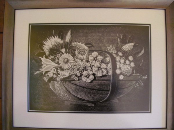 I was contacted a little while ago by someone who had bought a scraperboard picture at a local house clearance shop near where we used to live in Surrey. The chap who bought it had discovered a very tiny signature on the picture and followed it up by finding this website and contacting me to see whether I was interested in buying it from him. He didn't have to ask twice! I was intrigued to know the history of this little piece of artwork, as scraperboard was not my Dad's favourite medium and he didn't use it very often. I'd never seen the picture before, but recognised the trug as one that Dad used to use for gardening at home. Since the picture had been discovered at a local house clearance shop, I can only assume that it was something that he did for one of our neighbours as a present. I did contact the shop, but they couldn't remember where it had come from, so I suppose I shall never know.... unless anyone out there recognises it of course - in which case, do tell!