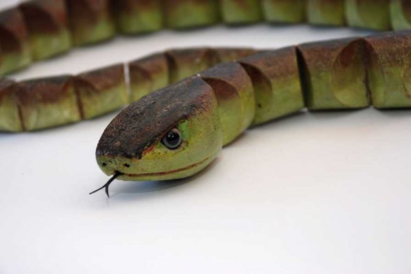 Next, a length of carpet webbing tape was produced and the numbered sections of wood were reassembled and glued in order along its length. The tape could bend from side to side, but was rigid top to bottom, so that the whole structure moved in a very realistic snake-like manner. Finally, the acryllic paints came out again, together with two beautiful onyx eyes and a forked tongue made of a short length of the plastic sleeve stripped from a fine electrical flex.