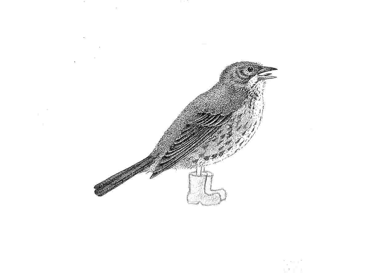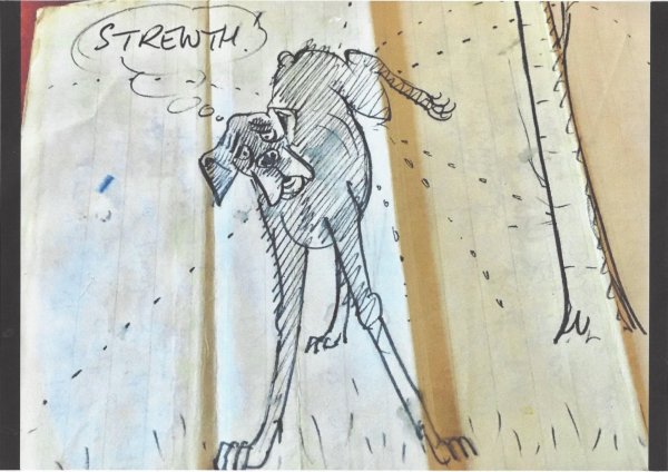 Every so often, Dad would start drawing something, then scrap it because he didn't like the way it was going. I got into the habit of periodically sifting through the bits of card and paper in his bin, to find small gems that I thought deserved a better fate. One such find was this little bird, which had been discarded before his legs had been drawn in. Usually, if Dad discovered the results of my furtive salvage operations, he would write something on them, like "Rescued by Sarah" or "Under Protest". In the case of this hapless (and legless) bird, when I pleaded to him to finish it off, he picked up a pencil... and this was the result.... Very funny, Dad!