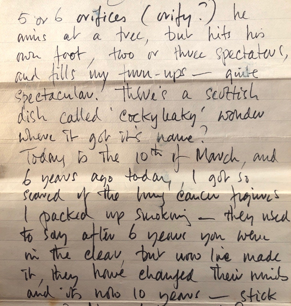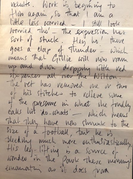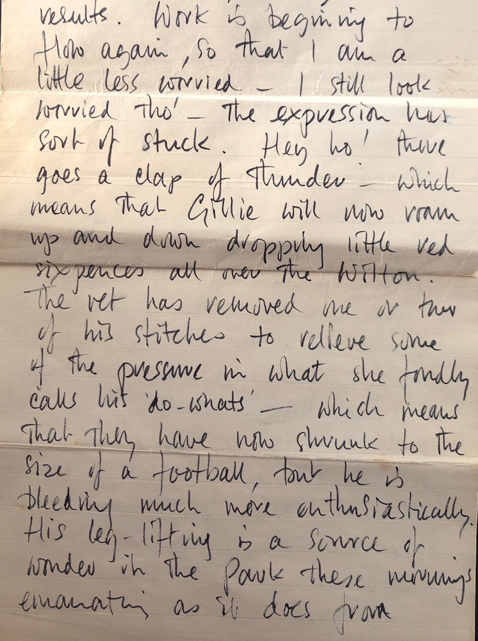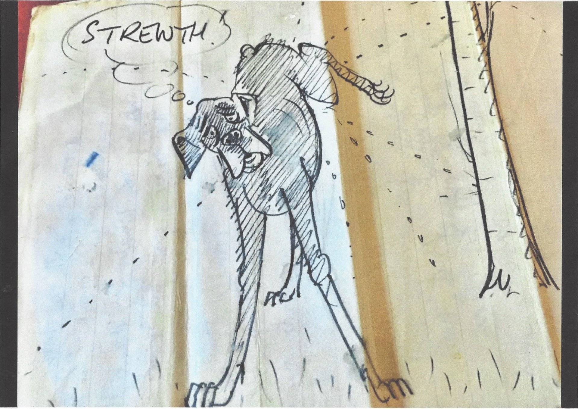 I recently found a letter, written to my sister, in which Dad describes what happened after our dog, Gillie, was recovering from an operation to remove bladder stones. Although we were all worried about Gillie, Dad’s sense of humour shone through, and he included a little sketch to illustrate his description.
